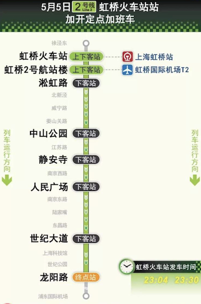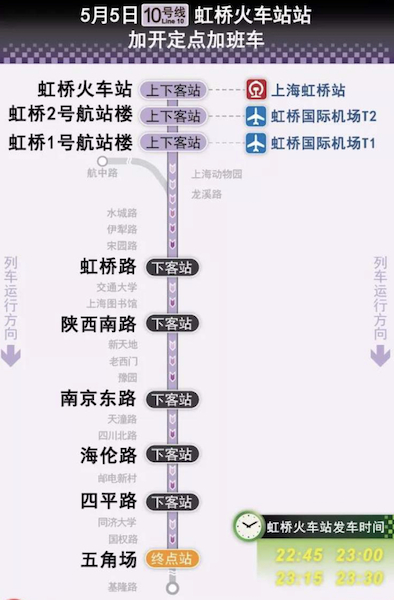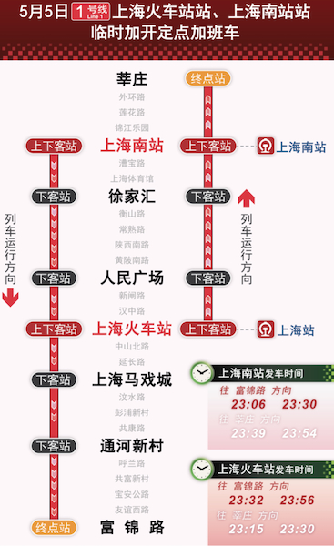 为提升五一返程期间重要交通枢纽夜间疏散能力,2021年5月5日(周三),在2号线虹桥火车站末班车后定点加开的基础上,1号线上海火车站站往莘庄方向、1号线上海南站站往富锦路方向,10号线虹桥火车站站往市区方向分别加开定点加班列车,最后一班定点加班车在三大火车站的发车时间延长至23:30,列车开行途中仅部分站点停靠,定点加开列车途经换乘站均不办理换乘。