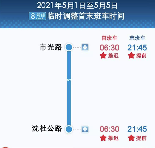 期间,8号线将缩时运营,全天运营时间临时调整为:5月1日至5月5日,8号线延后60分钟开始运营(首班车始发时间由5时30分延后至6时30分),提前45分钟结束运营(末班车始发时间由22时30分提前至21时45分)。5月6日节后首个工作日起,8号线将恢复以往正常首末班车时间。