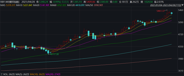 另据Wind数据显示,当前螺纹钢已创下10年新高,截至4月28日收市,上期所上市的螺纹钢期货主力合约报收5358元/吨,今年以来累计涨幅高达28.3%。