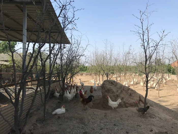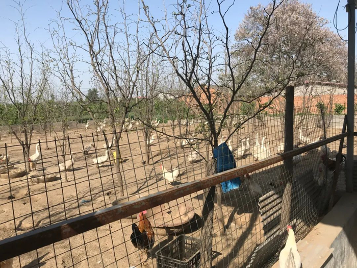 果然,沿着小土路走了不久,就听见鸡鸭鹅的叫声。看起来有上百只家禽,被铁丝网围着,周边是翠绿的麦田和树林。郭太安家的大门紧闭,上了锁。门前的牌子上,写有郭太安的电话,打过去,未有人接听。