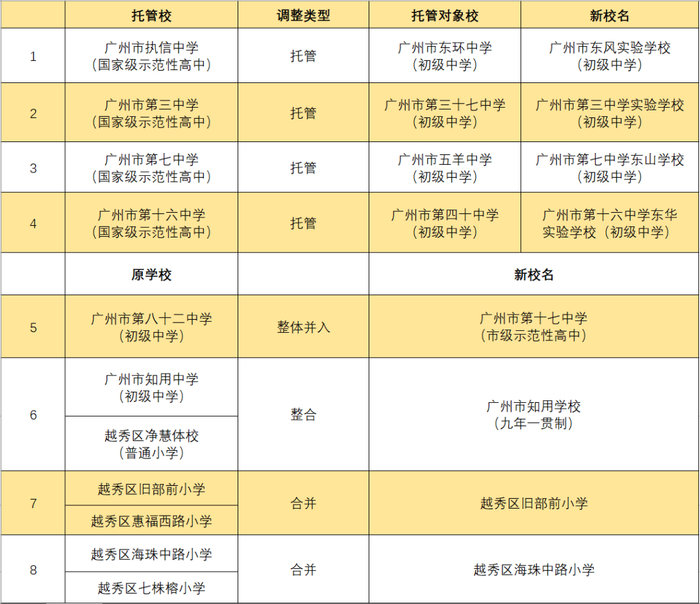 ●有4所学校进行托管,其中,广州市执信中学托管广州市东环中学,新校名为广州市东风实验学校;广州市第七中学托管五羊中学,新校名为广州市第七中学东山学校。