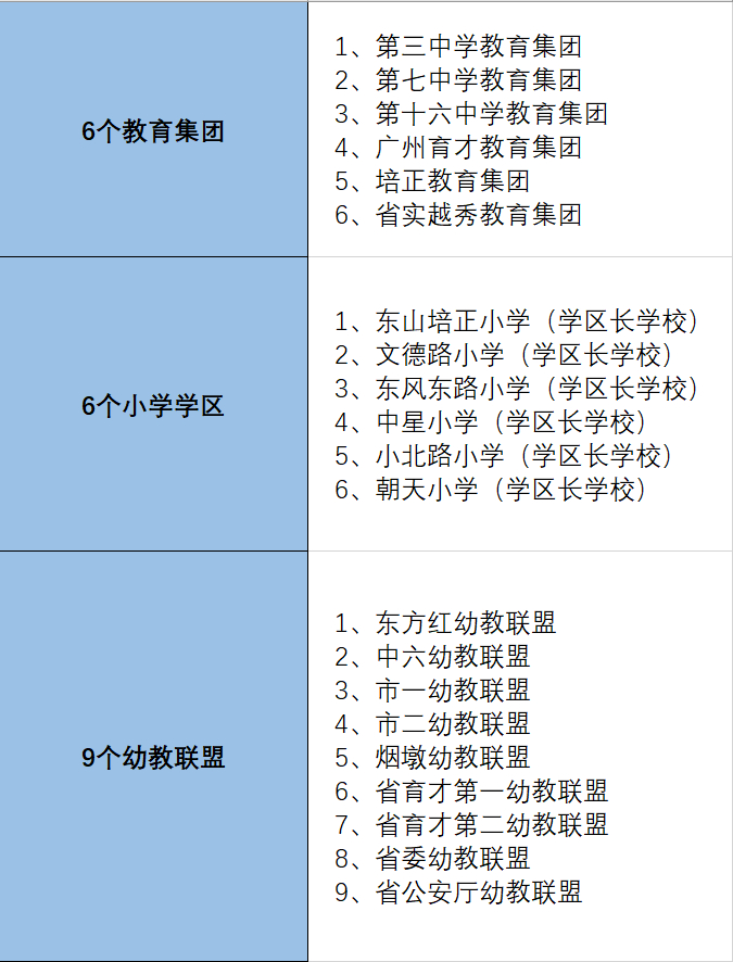 6个教育集团分别是:第三中学教育集团、第七中学教育集团、第十六中学教育集团、广州育才教育集团、培正教育集团、省实越秀教育集团。