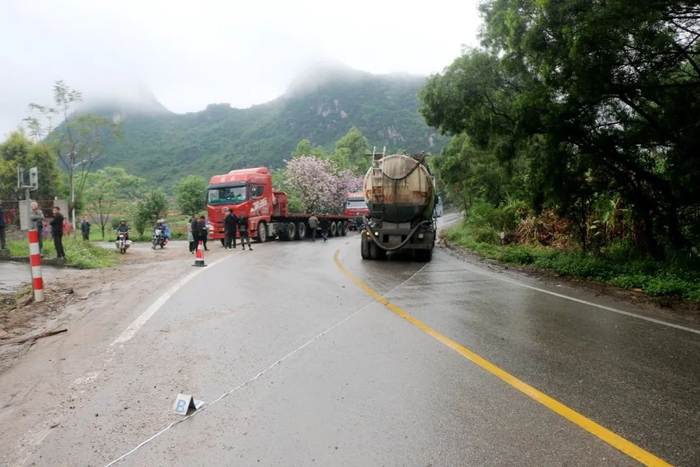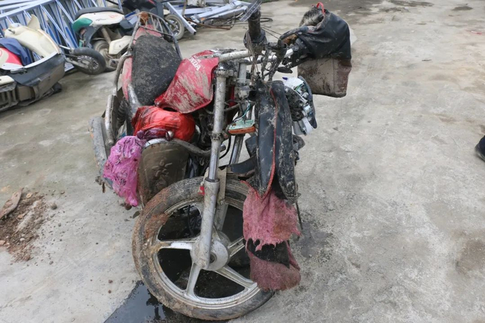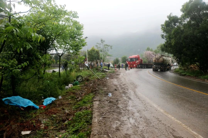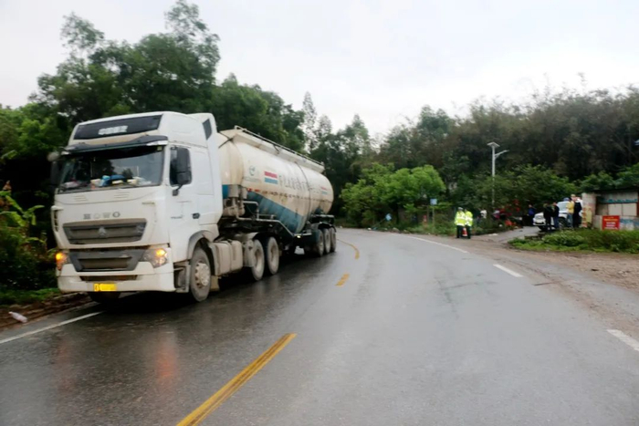 民警立即赶往事故现场,一辆重型半挂牵引车牵引一辆重型罐式半挂车停在道路旁边,一辆红色摩托车侧翻在大货车左后方的草丛中,车头位置严重变形,车上物品散落在地。