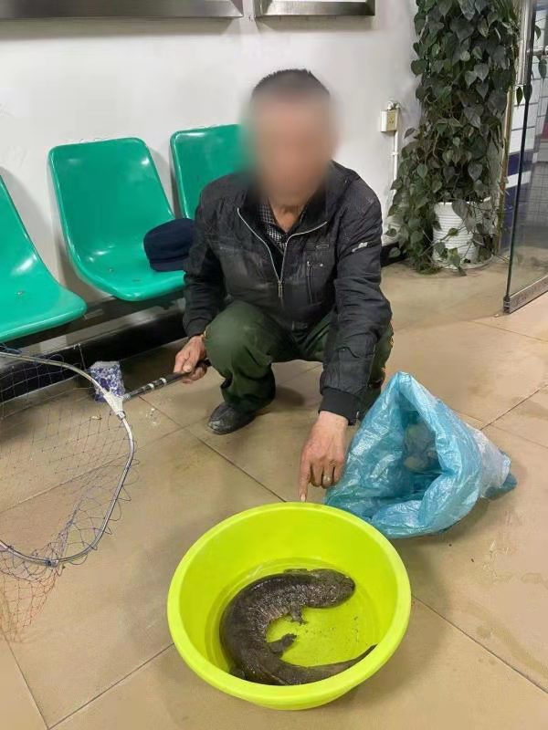 419日晚,江北区公安分局食药环侦支队和五里店派出所得到线索,有人在鎏嘉码头用渔网偷捕了一条娃娃鱼,民警立即赶赴现场。在一名五十多岁中年男子的手提袋中,查获一条近一尺长的娃娃鱼,民警立即将其控制,带回五里店派出所开展调查。