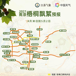 中国天气网讯 法国梧桐(文中简称“梧桐”)是江苏南京的遮阳伞、风景线,记录着这座城市的历史,并承载着浓浓乡情。然而,每年4至5月漫天飞舞的梧桐飘絮却让敏感体质的人十分苦恼。五一假期将至,江苏省气象服务中心、南京市绿化园林局与中国天气网联合发布2021南京梧桐飘絮预报,看看未来三天(4月30日至5月2日)南京哪些道路梧桐飘絮最严重?如何做好防护?