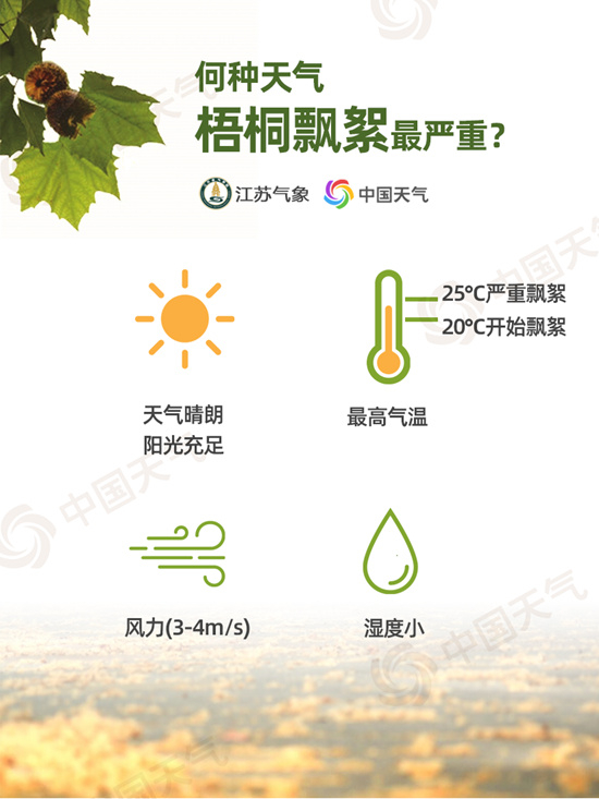 梧桐絮飘飞时段与气象条件关系密切,会受气温、风速、湿度等因素影响。当最高气温在20℃以上时开始飘絮,气温达到25℃以上飘絮严重;同时,当天气晴朗,阳光充足,风速在3~4米/秒、空气湿度足够小的时候梧桐飘絮最严重。