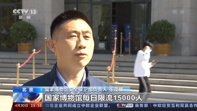 国家博物馆安全保卫部负责人 张茂福:国家博物馆每日限流15000人,分三个时间段参观入馆,目前不接受现场预约,全部采取线上限量措施,根据人流的这个现场流动情况,及时、灵活进行疏导,确保我们观众文明参观,安全有序参观
