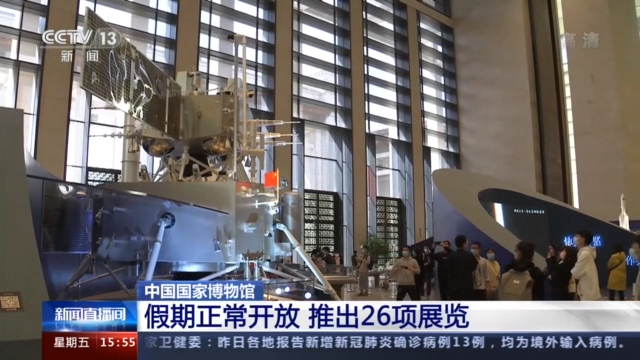 国家博物馆策展工作部负责人 胡妍:中国国家博物馆在五一期间,共有三个基本陈列展览,浓缩了中华5000多年的文明的辉煌灿烂,然后我们还有非常精彩的专题展览和临时展览,我们正在展出的这个月球样品001号,现在依然非常火爆,然后也希望大家尽快来看,因为我们将在5月7日就撤展了。