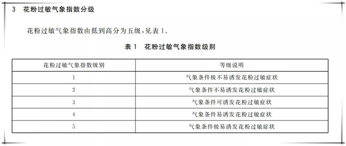 花粉过敏气象指数是依据花粉浓度对人体的致敏影响。划分的花粉浓度级别,根据《花粉过敏气象指数》标准(QX/T 324-2016)指数由低到高可分为五级。