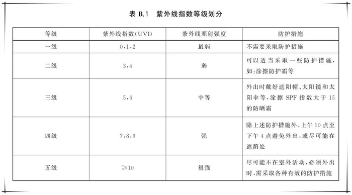 紫外线指数是对紫外线强度由弱到强进行分级,根据《紫外线指数预报方法》标准(GB∕T 36744-2018)紫外线指数可以分为5级,分别是最弱、弱、中等、强、很强,级数越高,紫外线越强,越需要重视。