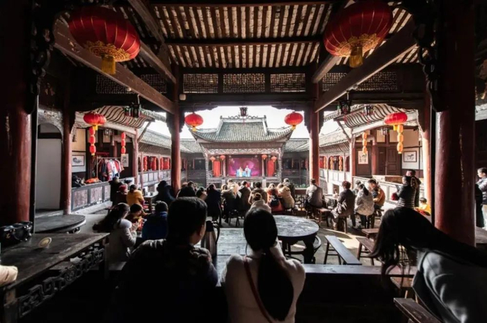 坐在木构的屋檐下,坐在斑驳的老圆桌边,放着花瓷茶碗,姿态轻松的人们,坐在厚重的长凳上,被苍古的巨大匾额环绕。看台前的演员顾眸流盼、唱念做打,仿佛穿越千年。