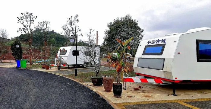 你也可以选择在黄家坝露营,利用露营基地现场布置的房车、帐篷等,深度体验不一样的原乡风情及安居古城。