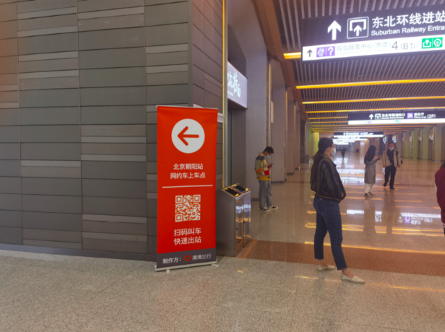 在朝阳站南1停车场J区和K区,开辟网约车停靠载客专区两块,按网约车不同平台划分,方便旅客定位乘车。同时,为了方便旅客快速找到网约车上车点,朝阳站增设了多处引导标识,协调滴滴客户端上线乘客步行引导卡服务功能,只要乘客在朝阳站叫车派单后,就能看到图文指引,便于找到上车地点。