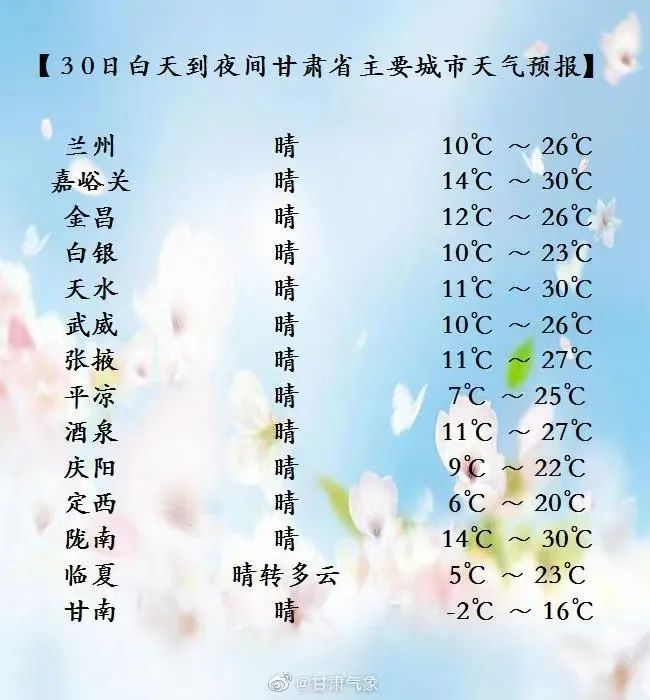 30日夜间到5月1日白天,甘南、陇南两州市晴转多云;省内其余各地晴。