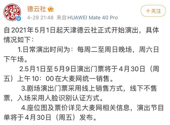 据@德云社 消息,5月1日起天津德云社正式开始演出,5月1日至5月9日的演出门票将于4月30日(周五)上午10:00在大麦网统一销售: