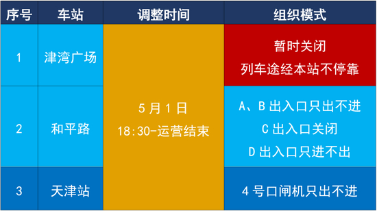 为做好客流疏导,天津地铁按照市有关部门要求,将调整运营组织模式,采取3号线列车限时跳停(在津湾广场站越站通过),重点车站部分出入口“单进单出”等限流措施,具体安排如下:
