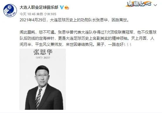 大连人职业足球俱乐部发文悼念。