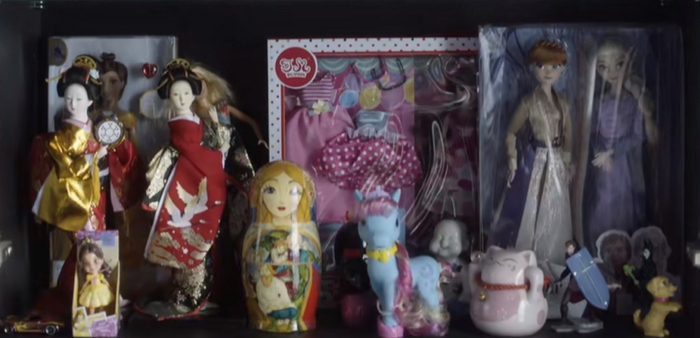 看着欢欢满柜子的娃娃,米桃流露出羡慕的眼神。