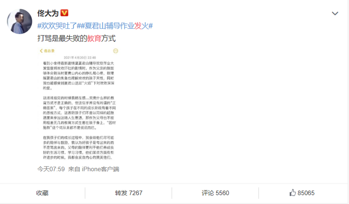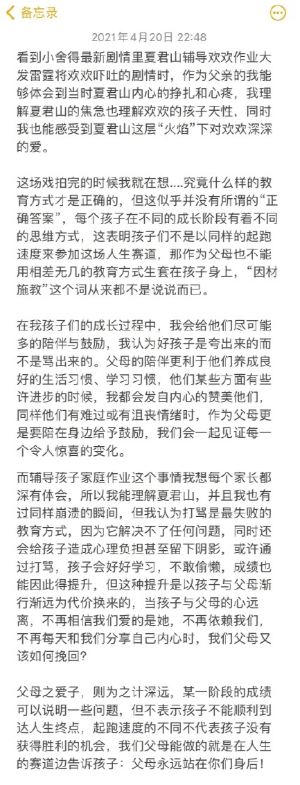随后,扮演夏君山的演员佟大为在微博发长文表示“打骂是最失败的教育方式”。