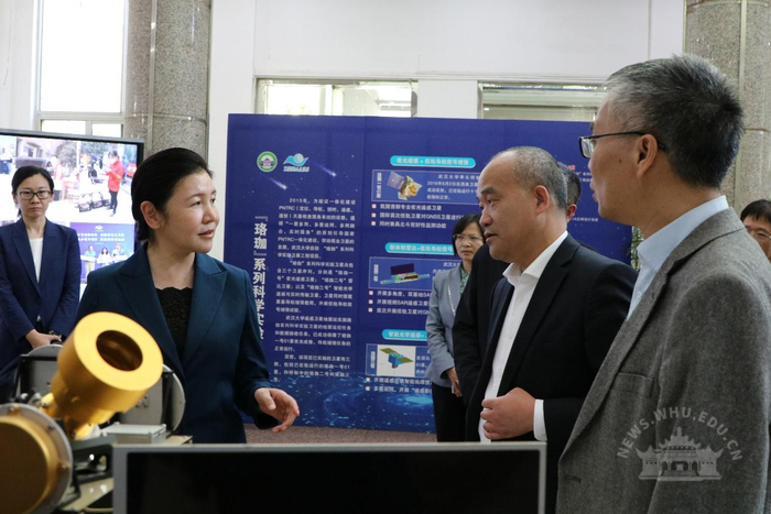 在测绘遥感信息工程国家重点实验室,实验室主任陈锐志引导讲解了珞珈系列卫星和资源三号卫星,窦贤康介绍了“珞珈一号”研制背景和主要功能。在实验室四楼虚拟现实实验室,贺荣听取了实验室代表性成果汇报。