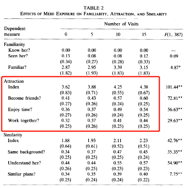 学期末,实验者让所有学生给这4名女生打分,结果是:出现次数越多的女生,吸引力越高。