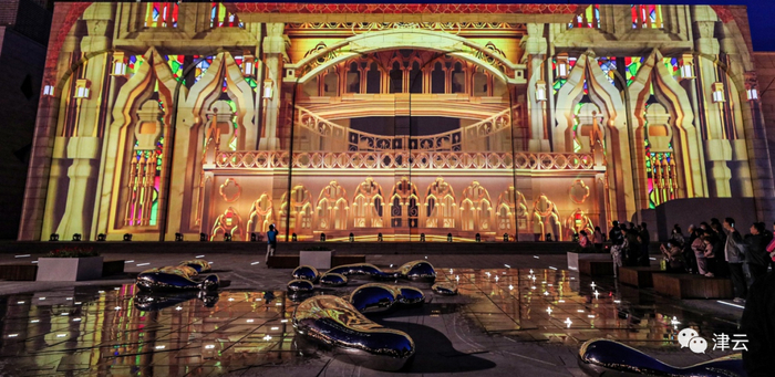 与马可波罗广场灯光秀相映成趣的是天津市规划展览馆前广场灯光秀,在面积约800平方米规划展览馆外墙上,投放的裸眼3D灯光秀气势恢宏光影绚丽,满目望去惊艳壮观,极具视觉冲击。