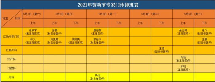 五一期间,门诊正常开放,急诊24小时开放,专家门诊安排见下表,超声科、放射科、检验科全天开放,总值班电话:13469967702