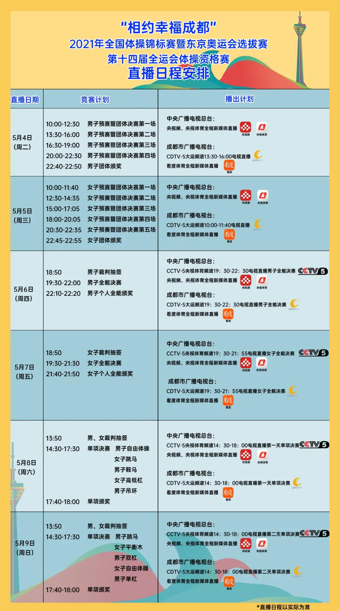 当前,“相约幸福成都”系列赛事活动正陆续展开,“重头戏”即将启幕——5月4日至5月9日,2021年全国体操锦标赛暨东京奥运会选拔赛第十四届全运会资格赛将在东安湖体育公园开赛,届时中央广播电视总台将全程转播此次比赛,这也将是东安湖体育公园的赛事“首秀”。
