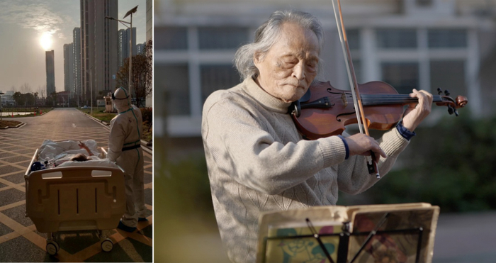 △这是一张拼版照片,左图为:2020年3月5日傍晚,在湖北省武汉大学人民医院东院,复旦大学附属中山医院支援湖北医疗队医生在护送患者王欣做CT的途中停下,让住院近一个月的老人欣赏久违的日落(甘俊超 摄);右图为:3月24日,“看夕阳的老人”王欣在东西湖区园艺花城小区内拉小提琴(新华社记者熊琦摄)。