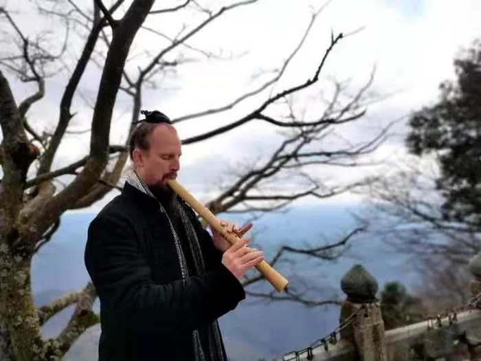 他的中文口语虽然还带着点生硬的口音,但水平已经相当不错,甚至开起了网络直播。他对着手机直播武当山的美景,讲解道教文化。