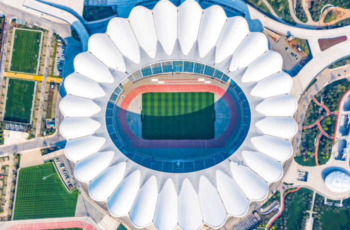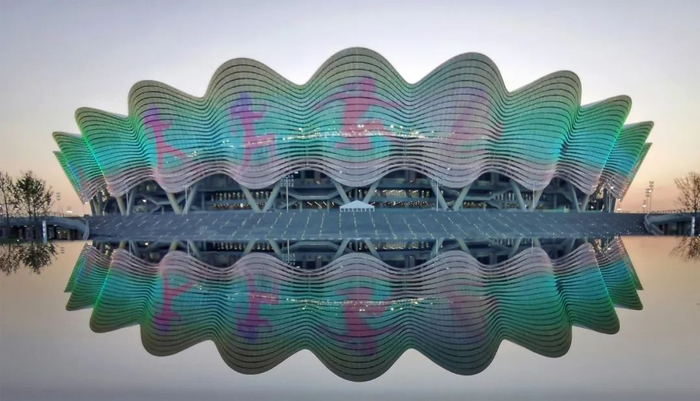 从空中俯瞰西安奥体中心体育场,就像一朵由28个“花瓣”勾勒出的巨大的“石榴花”。其总体设计的立意来源于古今丝路的历史脉络和西安市花石榴花的祈愿,轮廓主体建筑均采用单元组合的形态,抽象表现石榴花绽放的姿态和丝绸舞动的韵律。