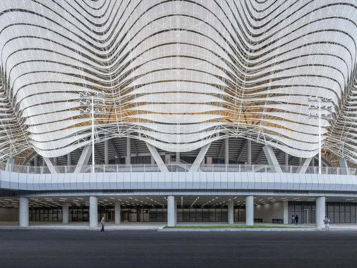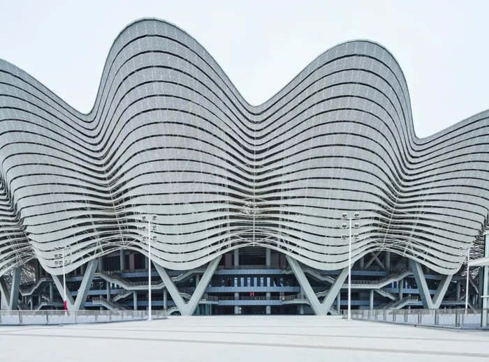 独特的罩棚形式和“马鞍形”的看台,呈现出起伏的屋面和立面,构成了体育场舒展的体量和丰富的光影。立面造型铝板系统的横向线条柔和舒展,随立面起伏开合,就像丝带一般轻盈,体现西安这座城市与丝绸之路的联想。