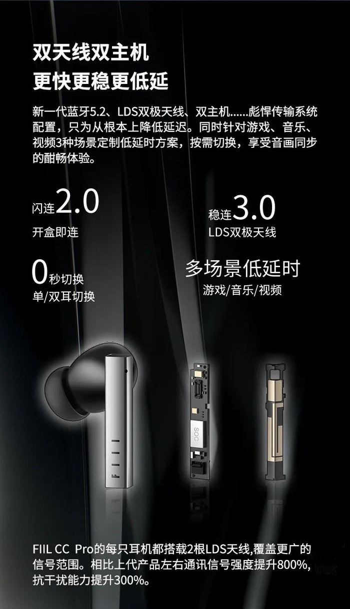 除此以外,FIIL CC Pro使用了新一代蓝牙 5.2、LDS 双极天线、双主机......这些配置都极大地提升了使用感受。