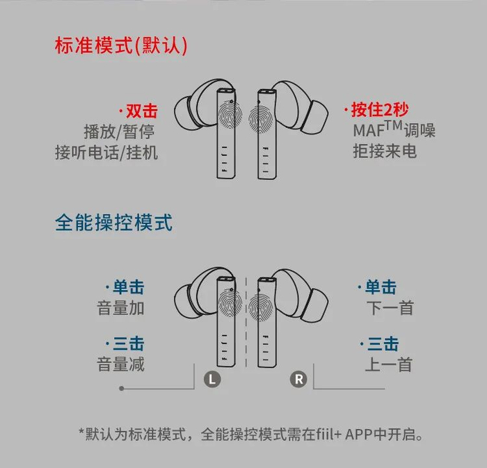 而在fiil+APP中开启“全能操控模式”后,单击右耳机一下即能切换下一首,三击切换上一首。