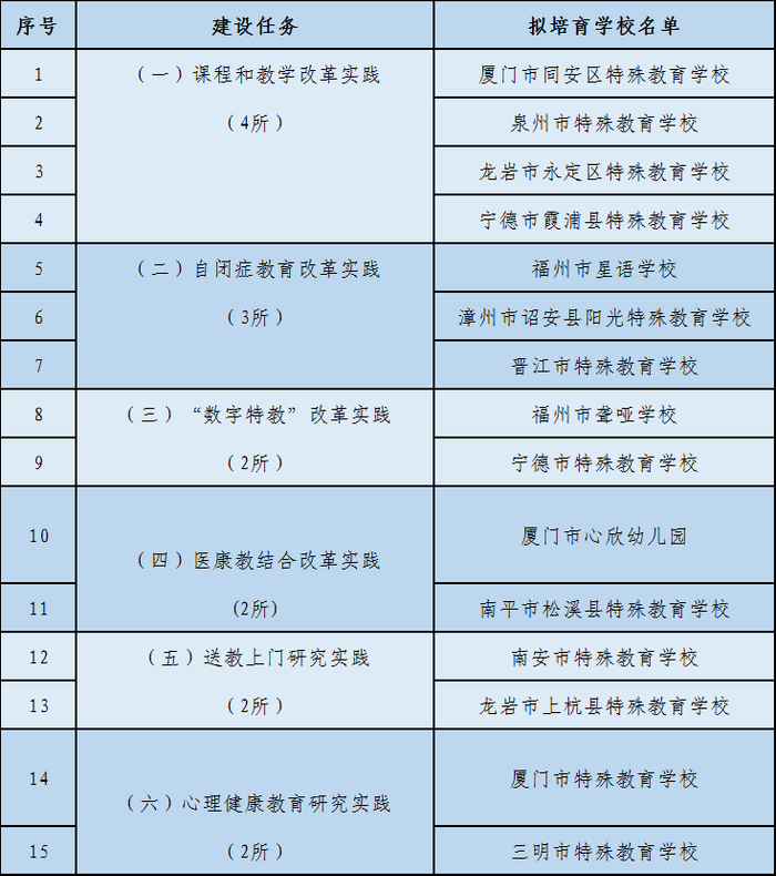 福建省特殊教育改革试点校拟培育名单
