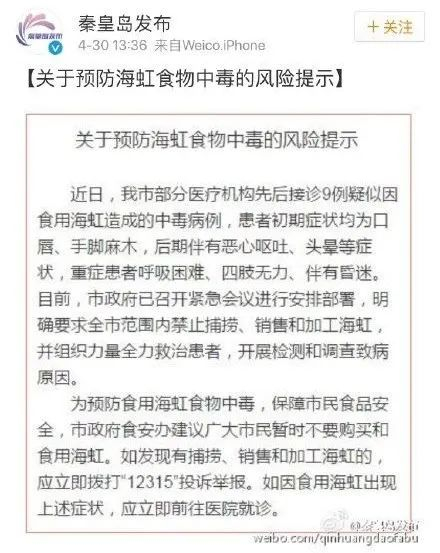 实际上,此前官方已经发过关于海虹等海产品的食用预警。3月25日,秦皇岛海洋和渔业局海港分局发布预警通告,禁止任何单位、个人在海港区辖区海域内采集捕捞海虹、毛蚶、扇贝。同时建议广大市民近期不要购买、食用海虹、毛蚶、扇贝等贝类。