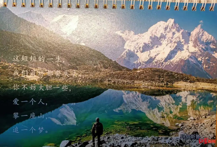 台历封面上印着这样几句话:“这短短的一生,我们最终都会失去,你不妨大胆一些,爱一个人,攀一座山,追一个梦。”