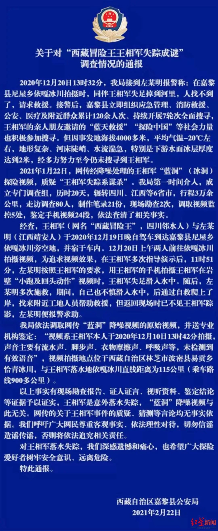 但在一个月后,2021年2月22日,西藏嘉黎警方发布通报称,王相军是意外落水失踪,网传“蓝洞”降噪视频与此无关,网传的关于王相军事件的质疑、猜测等言论均无事实依据,“视频系王相军本人于2020年12月10日13时42分拍摄,声音主要有流水声、脚步声、衣服摩擦声、呼吸声等,未检测到有效语音,视频拍摄地点位于西藏自治区林芝市波密县易贡乡恰青冰川,与王相军落水地依嘎冰川直线距离为115公里。”