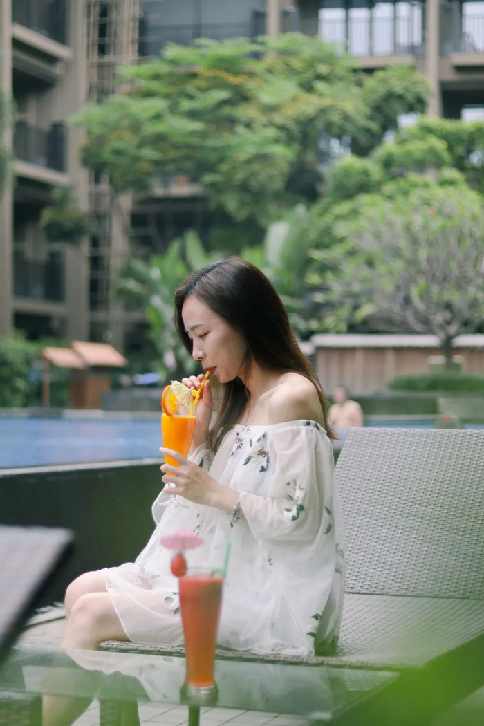 如果累了,女生还可以穿上仙气的泳衣,在泳池畔的躺椅上小憩片刻,喝一杯属于这个季节的果汁,满满的惬意感。