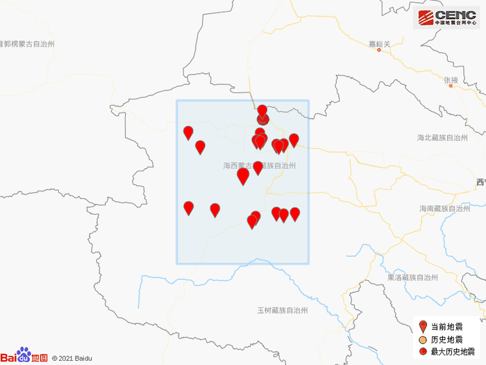 历史地震:根据中国地震台网速报目录,震中周边200公里内近5年来发生3级以上地震共21次,最大地震分别是2021年5月3日在青海海西州格尔木市发生的4.0级地震(距离本次震中0公里)和2020年3月24日在青海海西州直辖区发生的4.0级地震(距离本次震中172公里),历史地震分布如图。