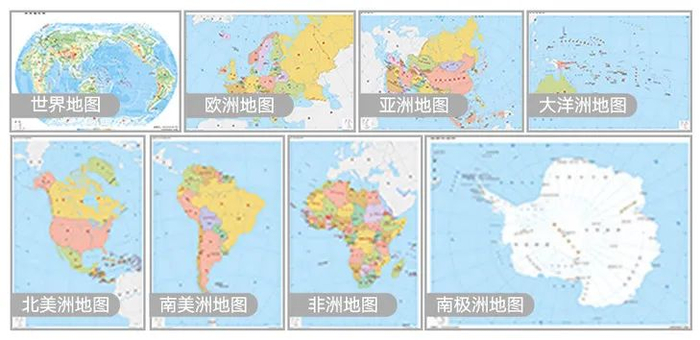 世界地形图,各个大洲的政区图,还有丝绸之路的手绘路线图。