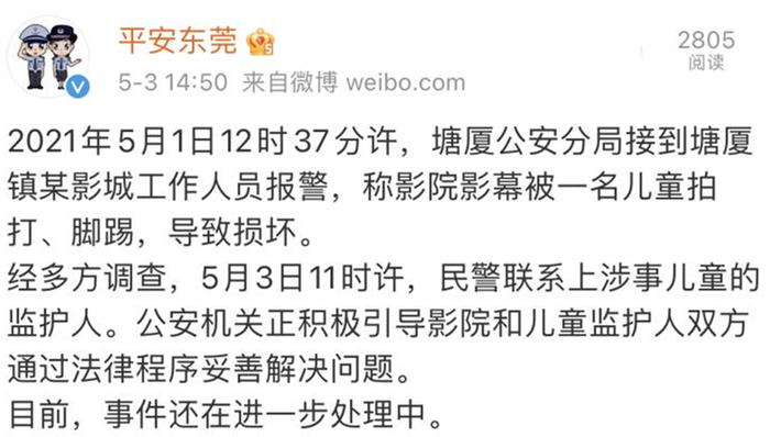 事发于5月1日中午12:10左右,东莞塘厦公安分局于12:37分许接到塘厦镇某影城工作人员报警,称影院影幕被一名儿童拍打、脚踢,导致损坏。