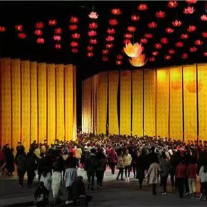 《又见五台山》演出场馆的设计,如一部经卷,经折形成的空间渐次展开,上面镌刻着《华严经》,外墙挂满风铃,随风轻响,犹如诵经之声雨润入心。内部空间陈设更加震撼心灵,从进入剧场大门的那一刻开起,经过长长的经书走廊,两侧布置着人们熟悉的生活场景——幼儿园、小学课堂、中学教室、大学宿舍、婚姻殿堂以及住过的客厅、用过餐的酒店、工作过的办公室等场所,最后一个硕大的观众席展现在眼前,360度不断旋转的舞台令人惊奇不已。