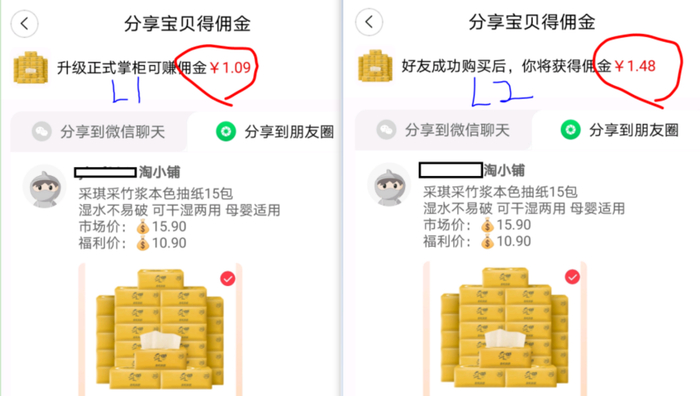 以个人版为例,第一财经记者自行前往应用商店下载淘小铺App并注册,成为了L0级别的掌柜,此时分享售卖单价10.9元的抽纸不能取得佣金;在分享售卖5件抽纸后,记者成为了L1级别的掌柜,并获得了1.09元的佣金。然而,个人版只能获得自购或分享购买商品的佣金,没有裂变效应。即,A将商品推荐给B,B再推荐给C,那么A能获得自购或分享售卖给B的佣金,C自购或分享售卖的佣金与A没有关系。