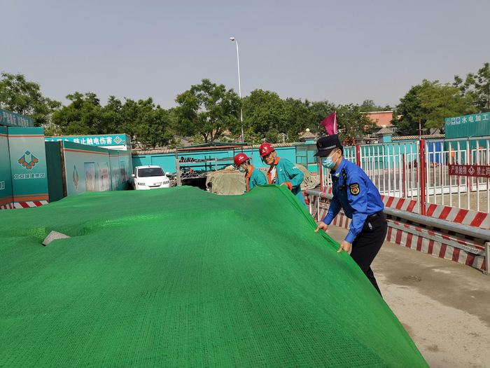执法队员发现,工地内有关土方施工作业的项目均已停工,大片区域覆盖上了绿色的苫网,分布在施工区域各个角落的雾炮机正在喷着水雾。但是,部分苫网接头处和破损处存在地面裸露的现象。“如果不加强洒水作业,苫盖不严,一旦遇到大风天气,干燥的物料颗粒就会形成浮沉,影响空气质量。”安定门街道综合行政执法队队员申充说道。在执法队员的要求下,工地工人立即进行覆盖完善,执法队员表示后期将加大检查频次,如果工地屡次出现苫盖不严的问题,将予以高限处罚。