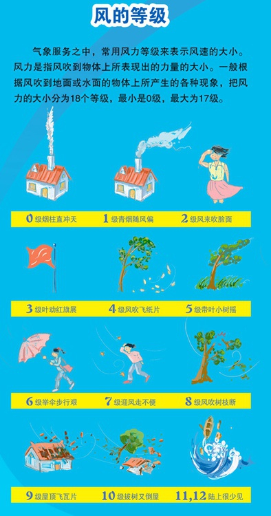 0级烟柱直冲天,1级轻烟随风偏,2级轻风吹脸面,3级叶动红旗展,4级枝摇飞纸片,5级带叶小树摇,6级举伞步行难,7级迎风走不便,8级风吹树枝断,9级屋顶飞瓦片,10级拔树又倒屋,11、12级陆上很少见。