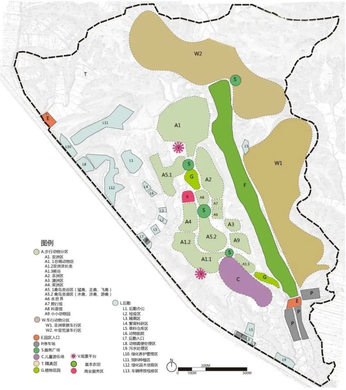 2.步行参观片区是动物园的核心区域,位于现有兰州绿色文化博览园的中心区域的山顶平地上,总体分布南北向较长、东西向较窄,包含亚洲区、澳洲区、非洲区、美洲区、珍稀动物区、小小动物园、海洋馆、生态科普馆、动物行为展示馆等,步行游览道路环绕中心区域布置,辐射周边展区。