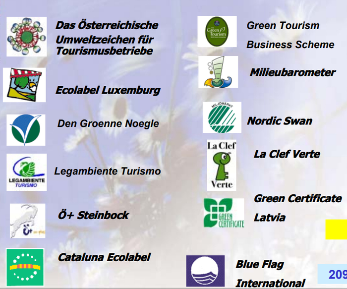 标志是相关标准体系的市场标识。世界上目前共有51种与生态旅游有关的标志。这些标志及其标准体系有国际通用的,如“绿钥匙Green Key”,“可持续旅游教育计划STEP”;有地区或国家内通用的,如“欧洲生态旅游标志标准EETLS”,东盟“绿色酒店Green Hotel Standard”,英国和爱尔兰的“绿色旅游商业计划GTBS”,德国“蓝色天使Blue Angel”;也有针对某一类旅游目的地的,如涉及36个国家的海滩和游艇码头的“蓝色旗帜Blue Flag”标志。图 3为欧洲各国与生态旅游有关的标志。