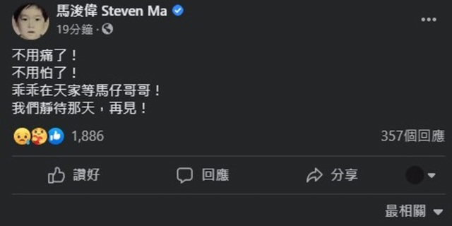随后,马浚伟在自己的社交网络账号发文悼念李明蔚:“不用痛了!不用怕了!乖乖在天家等马仔哥哥!我们静待那天,再见!”。