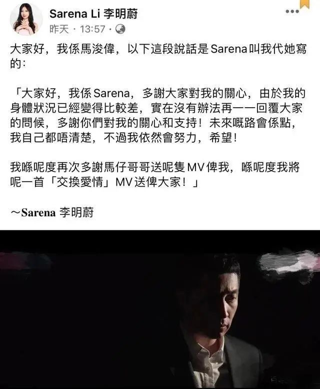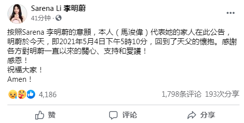 马浚伟称按照李明蔚的意愿,代表她的家人发布公告,李明蔚于2021年5月4日下午5时10分,病逝。